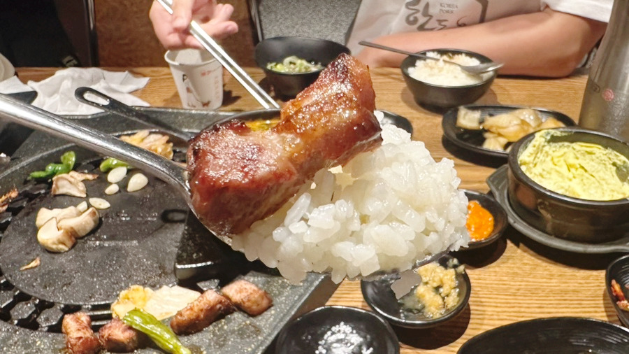 흰 밥 위에 고기 한 점 얹어서 먹으면,